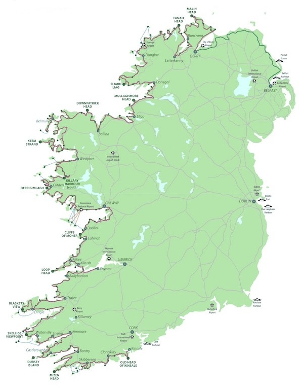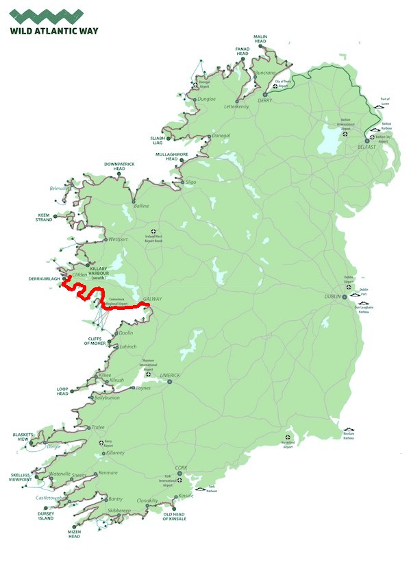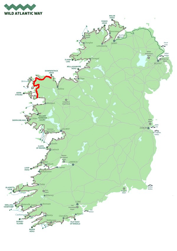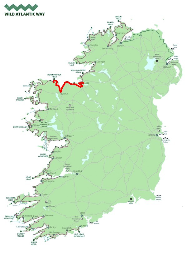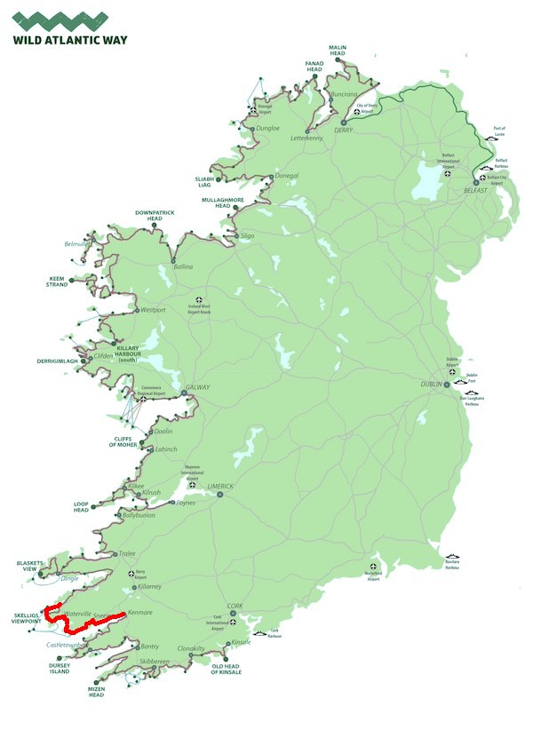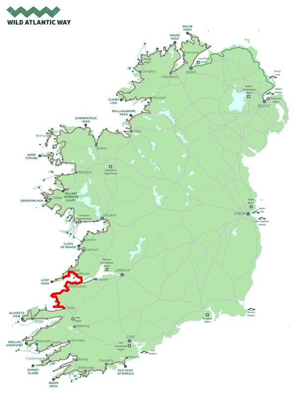 The Wild Atlantic Way is a 2000+ km route that traces the west coast of Ireland from Kinsale, County Cork, in the south, to Muff, County Donegal, in the north (or vice versa).