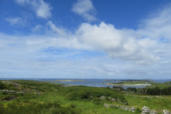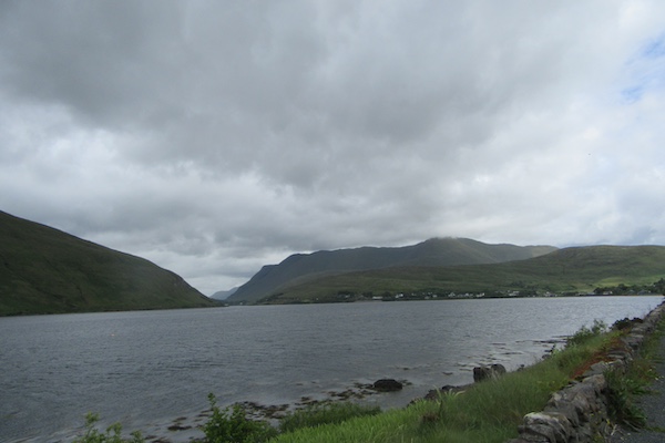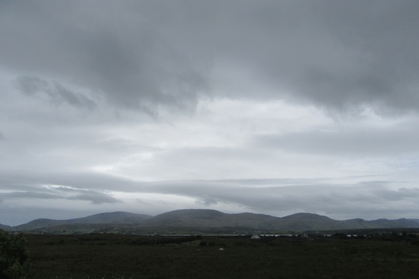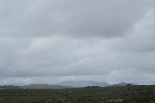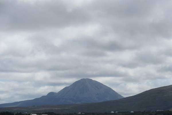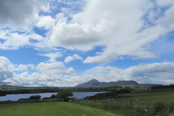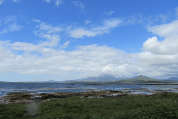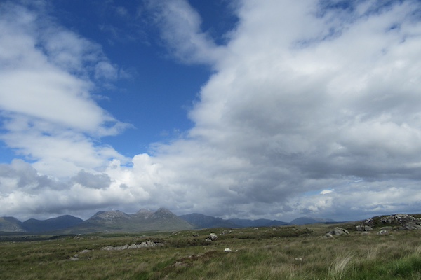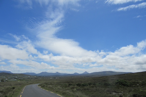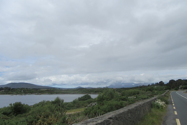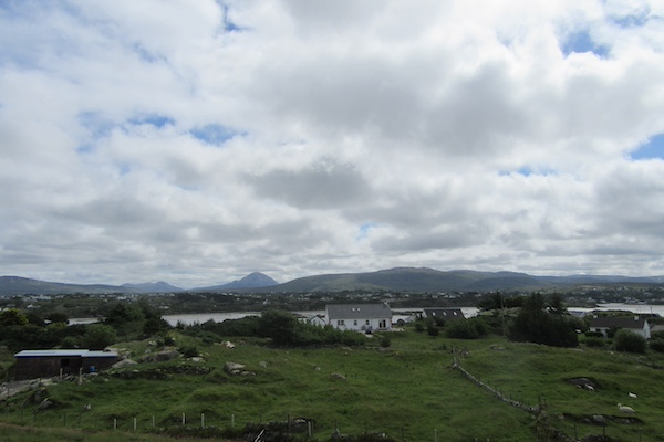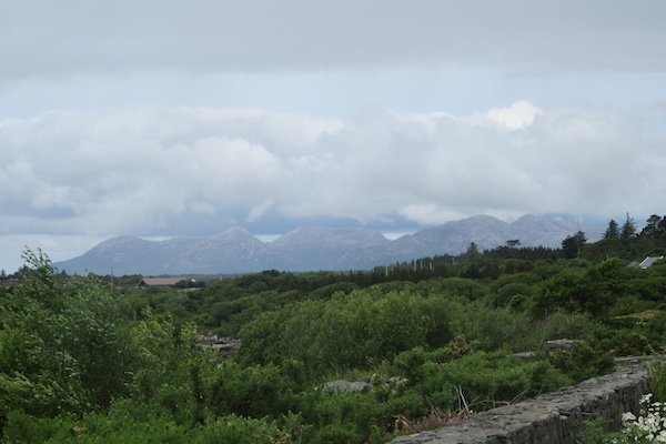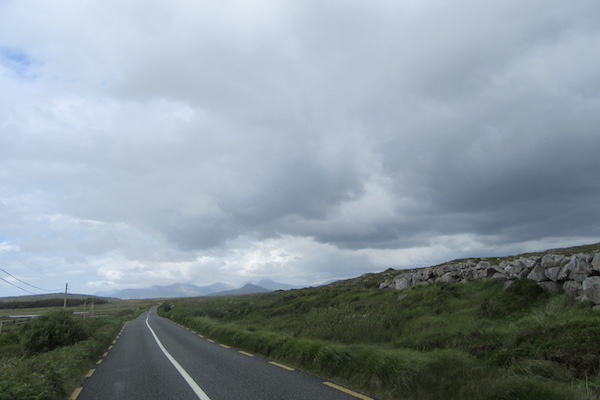Turning west again, the Twelve Bens (Na Beanna Beola in Irish) loomed in the distance. These twelve hills are familiar foes. Several years ago, I had tried to traverse six of them - the Benlettery Horseshoe - but had to turn back half way after my nerve failed me on the ridge between Bencollaghduff (Binn Dubh) and Bencorr (Binn Chorr). My nerve held the next year when I returned to try again. These Twelve Bens loomed large for the rest of the ride.