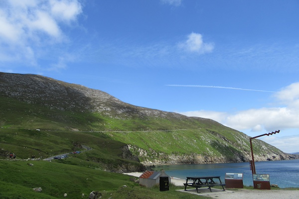 However, everything changed when I stopped before the downhill to Keel, when, unexpectedly, Keelin pulled over behind me. Our destination was Keem Bay, at the far west of the island. Unfortunately, between me and Keem Bay lay a steep climb and a steep descent (with the prospect of exactly the same in reverse as I rode back to Mulranny). But, nevertheless, we agreed to meet up at Keem Bay, and so we did.