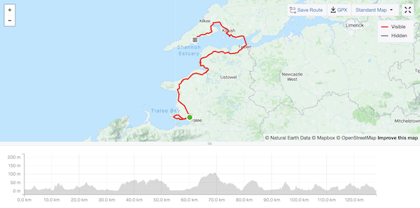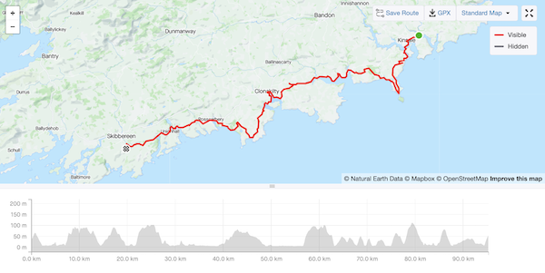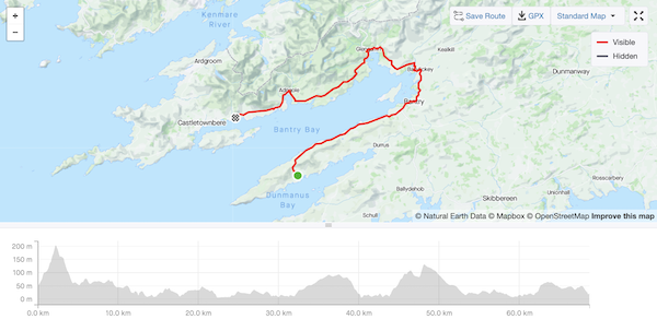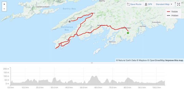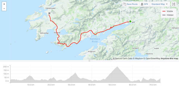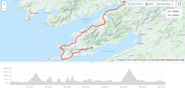 I got lucky with the wind. I was expecting a serious headwind all the way but it turned to a (cold) northerly cross-wind and I made good time out of Kenmare. Let's see what tomorrow brings, going back east-north-east to Kilorglin and Castlemaine, and then ... hold your breath ... due west into the Atlantic to Dingle when, one way or another, there will be a killer of a headwind, but the promise of a rest day to follow.