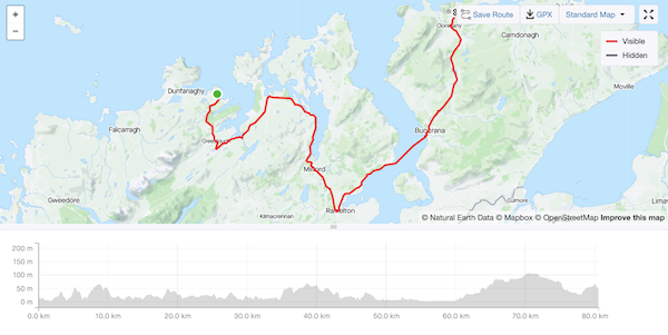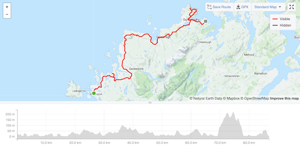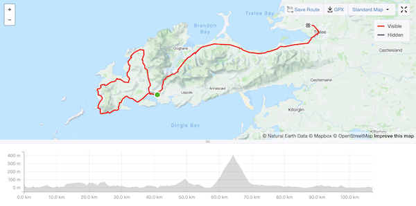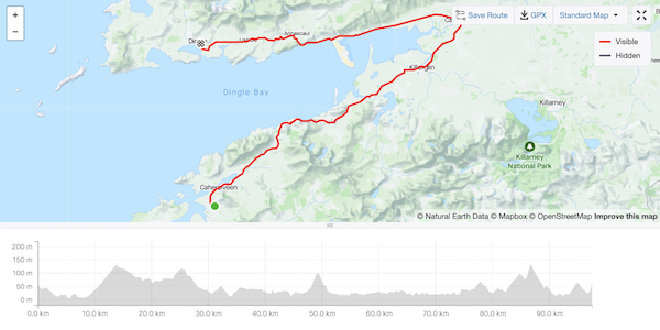 Today's ride was as expected. I caught a tailwind out of Cahirsiveen all the way to Glenbeigh, and then it dropped a little as I continued east-north-east to Castlemaine. Then, turning west on the south shore of the Dingle peninsula, the cycling gods do what they do and bring you back to earth with a bump: 44 km of strong headwinds all the way to Dingle. Tomorrow is a rest day, which I intend to use carb-loading and catching up on email.