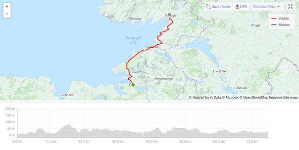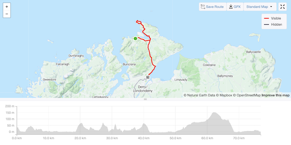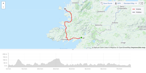 A few kilometers later, the Wild Atlantic Way heads further east to the coast but, with a long drive back to Dublin once I reached Muff, I decided I had seen enough headlands, enough coastal views, and ridden enough ramps. So, I settled into an enjoyable 40 km ride south, finally confident that I would reach my destination.