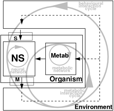 Fig. 1: Understanding cognitive systems as autonomous requires that we model their functioning as system-environment loops that contribute to self-maintenance. Metabolic self-production and behaviour appear intimatly related.