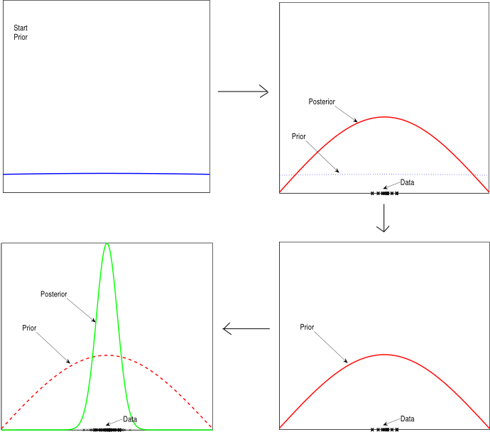 Fig. 1 : Illustrates the process of probability update during Bayesian online learning. The Bayesian framework can hence be used effectively to model the dynamics of a robot. We start with a certain prior probability of the dynamics model. We then apply a random command to the system (usually called motor babbling), observe the change of state this causes and accordingly come up with our posterior belief about the dynamics of the system. This posterior belief then serves as the prior for the next step of learning. This way the model of dynamics or equivalently the parameters of the model gets updated at each time step to reflect the experience so far [6]. The Randomly Varying Coefficient (RVC) model[7] is a probabilistic model based on this paradigm of Bayesian probabilistic online learning that combines the virtues of a Bayesian probabilistic framework and LWPR. In RVC the idea of independent localised learning is reformulated as a Bayesian probabilistic model thus resulting in an efficient yet robust learning algorithm suited for real time learning tasks like the one shown in Fig. 2. The figure illustrates an experiment where a composite controller consisting of a combination of feedforward and low gain feedback commands was used to control the joints of a simulated DLR arm. The feedforward command in turn was produced from an inverse dynamics model of the robot arm learnt online by an RVC model. The aim of the experiment was to learn an accurate model for the inverse dynamics of the robot arm online, while the robot performed a figure-8 pattern. The result of the experiment is shown in Fig. 2(b) where the pattern performed by the robot is shown at different stages of learning. The speedy convergence of the tracking establishes the effectiveness of the RVC method in real time learning.