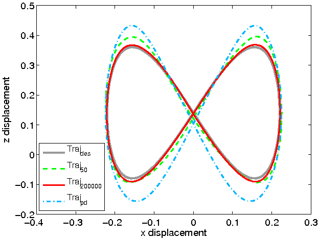 Figure 2.b: Learning of the dynamics of a simulated DLR arm using RVC. The tracking performance after different iterations of learning is shown. Traj_des represents the desired trajectory. Traj_pd represents a PD controller without any model of the dynamics. Traj_50 and Traj_200000 represents the tracking performance of model learnt by RVC after training over 50 and 200000 data points respectively. References
