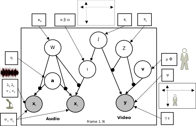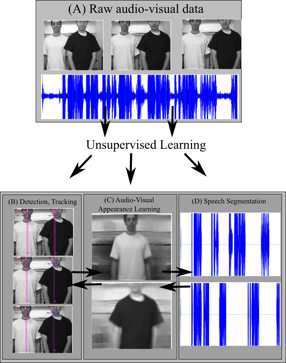 Figure 2: Operation schematic for audio-visual scene understanding system. Using raw data (a) as input for unsupervised learning and inference in the model (Fig. 1) allows tracking (b), appearance learning (c) and speech segmentation (d) The computer is equipped with an ideal observer Bayesian network model (Fig. 1) describing sources (e.g. people) in the world as potentially (but not necessarily) audible and/or visible. It also describes the potential correlation in these observations if a source is simultaneously both speaking and visible (via the dependence of the inter-microphone signal delay on the source position). No parameters of this model (e.g. what people look or sound like) are pre-specified. Given the chance to observe raw data of some people moving and speaking (Fig. 2a), the system bootstraps itself without supervision, learning the model parameters (e.g. people's visual appearance, Fig. 2c) from correlations in the data using expectation maximization (Bishop, 2006). It infers in real time the people's states, including where they are (Fig. 2b) and de-noised estimates of their appearance and speech. Simultaneously, (and purely by inferring the causal structure of the Bayesian network), the model effectively judges at each timestep whether each person is present, whether they are speaking and who said what (Fig. 2b,d). Note that unlike the lost dog example, the causal structure here is of intrinsic interest, as knowing who said what in a conversation may be crucial to its understanding. The ideal observer model effectively judges causal structure questions such as who said what (Fig. 2d) on the same bases described earlier: Whether the visual and auditory cues come from the same bearing, who was last thought to be at that bearing and the match between the visual and auditory cues with the parameters learnt for each person. In addition, the structure inference allows effective tracking through occlusion/silence in the visual/auditory modalities - a typical point of failure in traditional approaches.