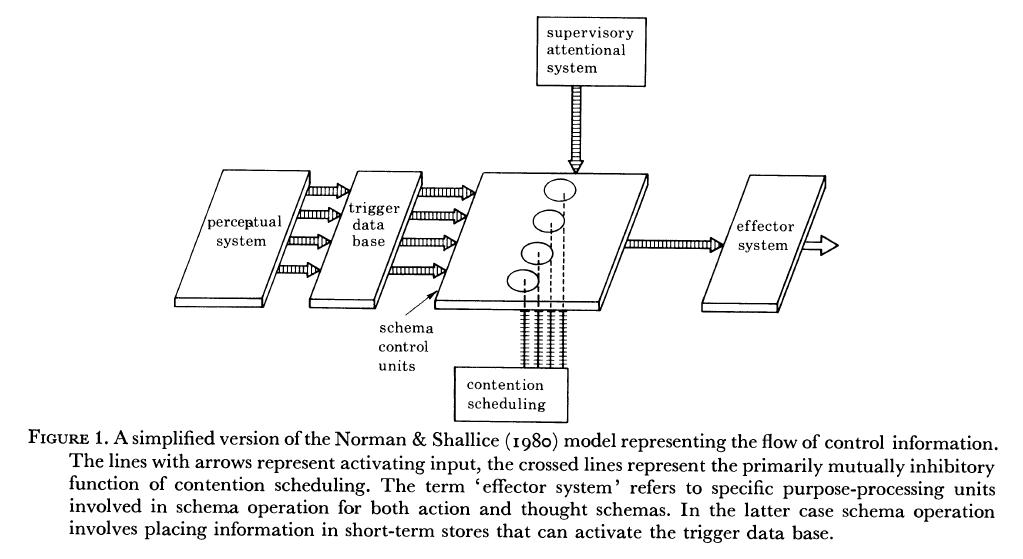 Automatic control consists in the activation of routines and habits. Behavior is guided by sensorimotor ''schemas'' that compete and cooperate, and are selected depending on the cues and affordances in the environment, as well as on internal motivations and drives. For example, we can almost effortlessly perform routine operations such as avoiding a chair when moving, opening a door, writing a sentence or two, etc. All these tasks are performed by us in many cases without awareness, and we are not surprised that our muscles coordinate exactly for doing what we have in mind. This is the simplest form of action control, and for this reason it is supposed to be available to several organisms and not only to humans. Further evidence for control by schemas and habits in humans comes from “slips of action”: it can happen that during a planned action (say, driving to the beach) another, more familiar action pattern (say, driving to the office) interferes and the result is taking the wrong route. At the automatic level schema selection is operated by a mechanism referred (in the figure) as ''contention scheduling''. Since cognitive resources and the effectors are limited (e.g., an agent can not go on the left and on the right at the same time), it selects a restricted numbers of compatible schemas so that they take control: hopefully, the most relevant schemas are selected at the right time. These schemas then operate until their task is achieved or a much higher priority schema is triggered. Norman and Shallice (1986) propose however that not all behavior functions in that way, and that a single, general executive component is not sufficient for explaining actions. There are in fact two problems. First of all, not all situations are routine. While schemas can account well the achievement of routine tasks, novel tasks require more complex cognitive operations, such as for example a general planning component that can in principle be applied to any problem domain. The second problem is that, even if each single part of an action can be a routine, how to concatenate and organize several schemas can be tricky and not routine. This is where ''willed control'' comes into play. It uses an attentionally limited controller, the supervisory activating system (SAS), that is responsible for more complex cognitive operations and in general intervenes when routine control is insufficient. It can organize, coordinate and monitor (with attention and awareness) schemas in order to achieve novel and complex tasks, acting as general-purpose planning component that can also adapt to novel domains. The supervisory attentional system (SAS) is highly related to the concept of working memory (WM) in Baddeley and Hitch (1974) and in particular to its main component, the central executive. It is also related to the concept of intention as used in (Bratman, 1987), and to awareness and consciousness in the ‘global workspace theory’ (Baars, 1988). Shallice (1982) studied impairments of complex action planning (in SAS) is patients with frontal lobe damage. Although these patients were able to perform individually several actions, they had problems in coordinating them, perseverating, and often get distracted. Evidence for a distinction between automatic, habitual control and attentional, supervisory control is also reported extensively in social psychology. Bargh and Chartrand (1999); Bargh and Ferguson (2000) reported that often people are unaware of habits that are socially determined and guide their behavior. People for example imitate face expressions and body postures, and tune their actions (e.g., speed of walking) depending on habits and stereotypes.