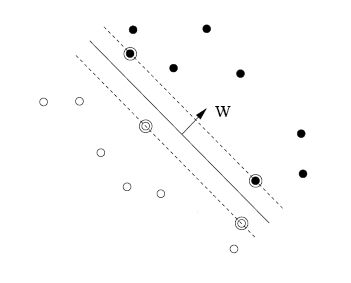 Figure 1. Maximum-margin separating hyperplane. Linear algorithms for binary classification find a separating hyperplane in the input space that divides the two classes. If such hyperplane exists, the problem is said to be linearly separable. In this case it is always possible to find a maximum-margin separating hyperplane which is at equal distance from the two classes. The distance between the hyperplane and the classes is thus maximal, and it is called margin. See Figure 1. The margin is related to the difficulty of the classification task. It is also linked to the generalization performance of the classifier. If the problem is not linearly separable we could think to use a non-linear separating surface, instead of a hyperplane. But to retain all simplicity of linear classifier, a common trick is to transform the data with a non-linear transform and then apply the linear algorithm (see for example Slow Feature Analysis [2] for a similar approach and a discussion on the biological plausibility of the method). This will result in a non-linear surface in the original space. Of course this comes at the expense of an increase of the input dimensionality and hence of the computational complexity of the algorithm. However in most of the algorithms we just need to access to the inner products between the samples. So we can use a function that is returning directly the inner product in the transformed space, from the original input samples. This function is called Kernel function and it is the core of the Support Vector Machine (SVM) algorithm. We can use kernels in online linear algorithms too, obtaining non-linear versions, almost for free. The price to pay is that the size of the solution will be proportional to the number of training samples. Note that the same is true for the SVM. This is of course unacceptable if you consider the fact that the number of training sample is potentially endless in the online setting. There is a big number of online learning algorithms in the scientific literature. The "quality" of an online algorithm is measured by how good its predictions are, and most of them provides a bound on the maximum number of mistakes they will commit in the worst case scenario. These bounds compare the performance of the algorithm to the best possible hypothesis in the same functional space. Often the algorithms itself are designed to have good bounds, that is to provide performance that are asymptotically close to the best hypothesis (that is with small "regret"). These bounds also provide a principled way to compare different algorithms. Note that a better bounds does not always imply better performance, but it often implies a better "controllability" of its behavior. We could draw a parallel between the preference for algorithms with bounds and the preference in robotics for actuators that have a mechanical design that simplifies the mathematical forms of the equations to control them. Online learning algorithms include, for example, the Perceptron algorithm [3]. More modern examples include the ROMMA algorithm of Li and Long [4], Gentile’s ALMA algorithm [5], and the NORMA algorithm [6]. A framework of online learning for structured learning is the Passive-Aggressive online algorithm [7]. All these algorithms observe examples in a sequence of rounds, and construct the classification function incrementally, by storing a subset of the observed examples in their internal memory. The classification function is then defined by a combination of kernel function evaluated on the stored examples. This set of stored examples is the online equivalent of the support set in SVMs. Note all the above algorithms can be easily extended to the multiclass setting, see for example the MIRA algorithm [12]. Other interesting variants include the case of multiclass classification in which after the prediction the true label is not disclosed, but we only receive a binary feedback (right/wrong prediction). This setting is close to the reinforcement learning setting and even in this case it is possible to design good algorithms with mistake bounds [13]. Given the fact that many of the most important algorithms are based on the Perceptron, we will describe it in more details.