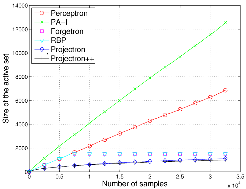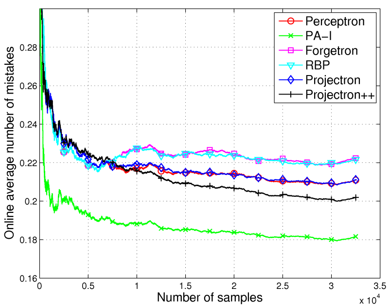 A different approach was followed in Orabona et al. [10] using online variant of the SVM with a limited number of support patterns called OISVM. Starting from this last algorithm Orabona et al. have proposed the Projectron [11]. The Projectron is based on the idea of approximating the new samples with the old ones, in order keep the size of the solution bounded, but at the same time retaining most of the accuracy of the solution. We briefly review in the following some budget online algorithms and the Projectron.